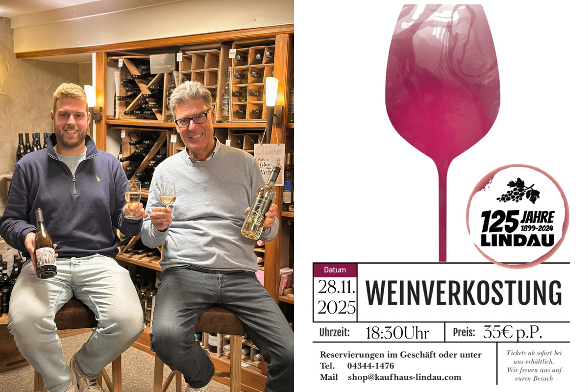 Der Inhaber des Modehaus Lindau, Knut Lindau berichtet "Freut euch wieder einmal auf unterhaltsame 2,5 Stunden mit 7 leckeren Weinen aus unserem Wein-Sortiment. Es gibt viele neue Geschmacksrichtungen zu entdecken, unter anderem neue Sorten aus dem Weingut Behringer. Dabei machen wir eine Weinreise mit Weißwein, Roséwein und Rotwein. Dazu reichen wir Brot mit leckeren Dips.