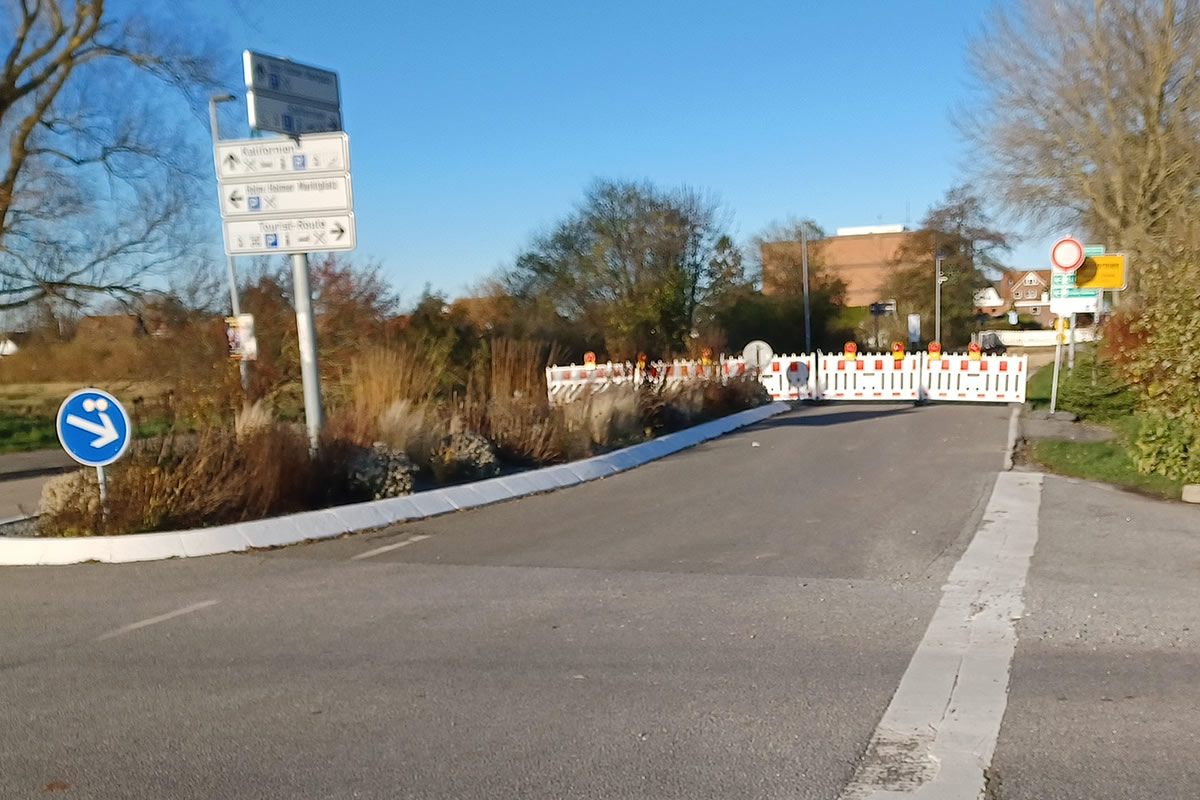 Am Dienstagmorgen, 18.11. wurde - wie bereits angekündigt - die Einfahrt nach Kalifornien komplett gesperrt. Die Umleitung wurde ausgeschildert und die Arbeiten haben begonnen.
