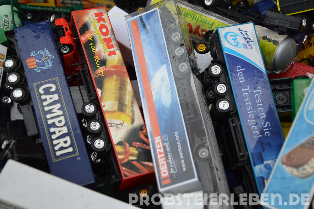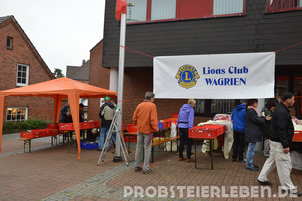 Gefragt waren am Sonntag zunächst vor allem Regenplanen. Jeder Anbieter hatte sie immer griffbereit und nutzte sie auch – notgedrungen. Etwas schwerer hatte es da der Lions Club Wagrien, der mehr als 20 Tische mit Bücherkisten bestückt hatte. "Wir haben uns gesagt, wenn schon, denn schon, Abstriche machen wir nicht", so Lions-Präsidentin Susanne Elbert. Mit Hilfe eines LKW von Jochen Mundt und einem Gabelstabler wurden die sechs Paletten mit je 28 Kisten bestückt und in den Knüll gebracht. Die Gemeinde Schönberg hatte dankenswerterweise einen Anhänger mit Tischen und Bänken abgestellt.