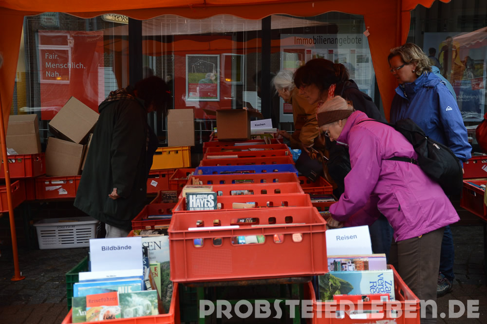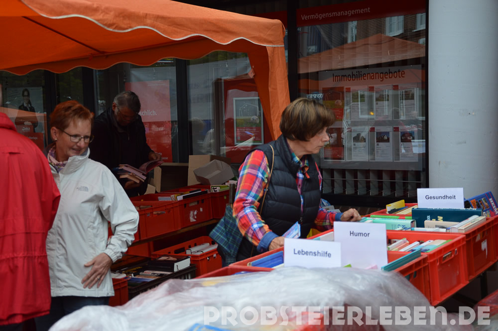 Das Wetter meinte es nicht gut mit dem Flohmarkt am Sonntag in der Schönberger Fußgängerzone. Viele der Flohmarktanbieter schreckte das Wetter offenbar ab, sie kamen trotz Anmeldung nicht. Das alles konnte die Mitglieder des Lions Clubs Wagrien nicht schocken, sie hatten wieder eine Riesenauswahl an Büchern mitgebracht, und die Schönberger dankten es ihnen.