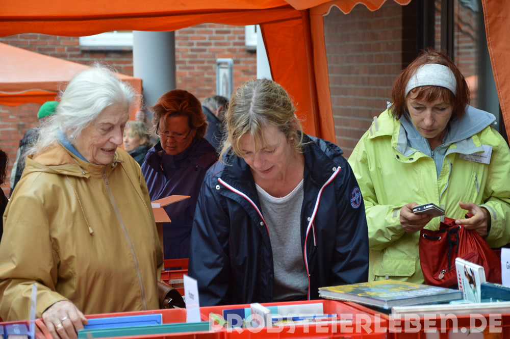 "Wir haben drei Pavillons mitgebracht und fünf Malerfolien, nun sind wir Profis im Ab- und Zudecken der Bücherreihen", schmunzelte die Lioness im Nachhinein. Denn mit den ersten Tropfen gleich nach dem Aufbau mussten die Tische abgedeckt werden, kaum ließ der Regen nach, kamen die Planen wieder weg. Und die Schönberger – sie schreckte das nicht. Während es goss, trafen sie sich unter den Zelten der Lions, schnackten und klönten. Kaum ließ der Regen nach, bummelten sie an den Ständen entlang.