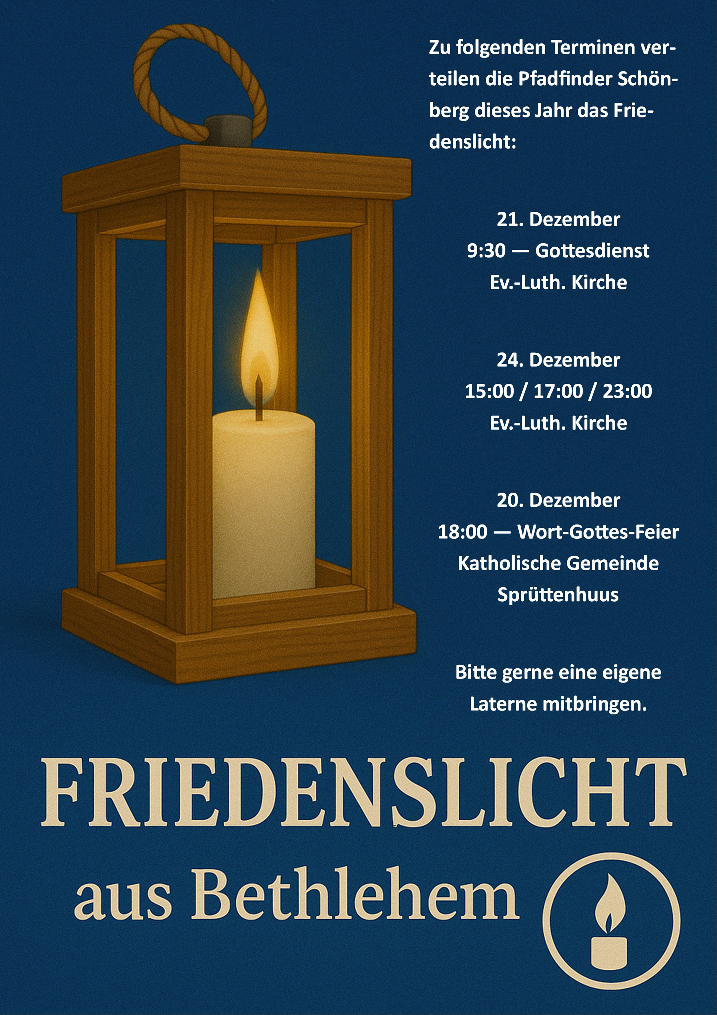 21. Dezember um 9:30 in der Ev.-Luth. Kirche Schönberg mit der Verteilung des Friedenslichts.